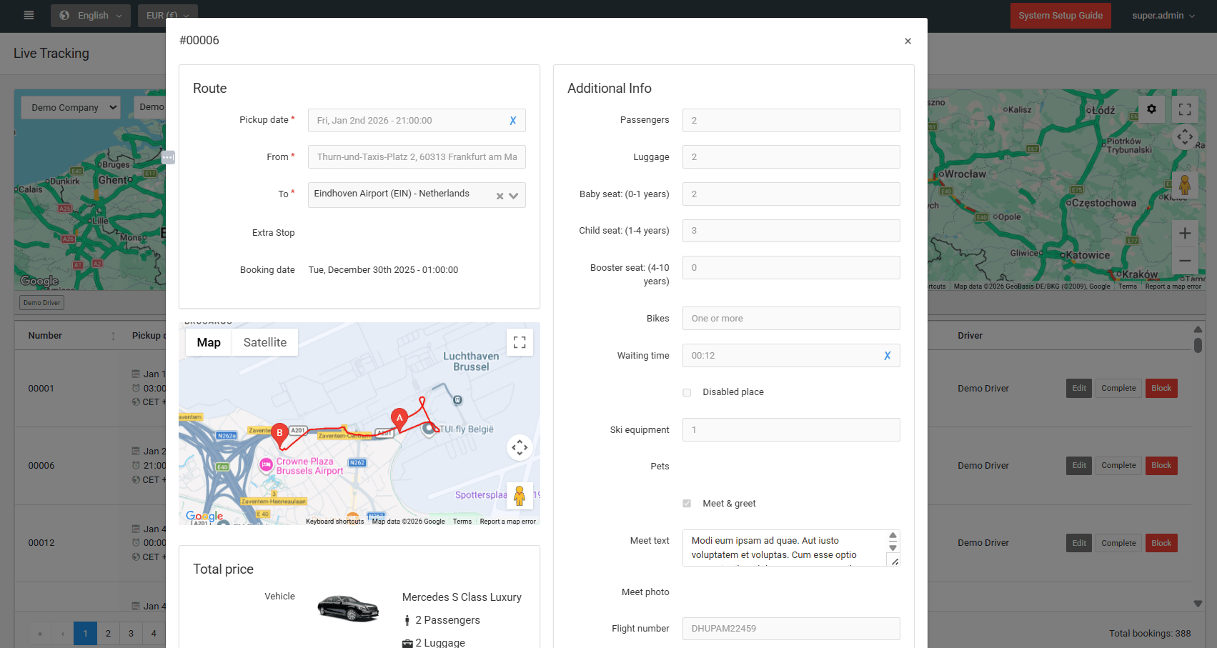 See all drivers and active trips on a real-time map. Your taxi dispatch software updates positions continuously, giving you a clear operational picture.