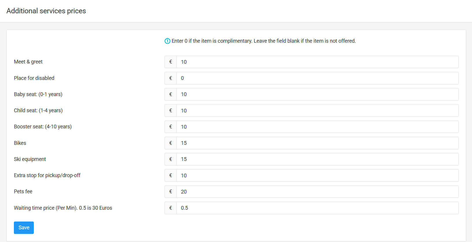 Charge for additional services such as child seats, extra luggage, waiting time, or special requests.