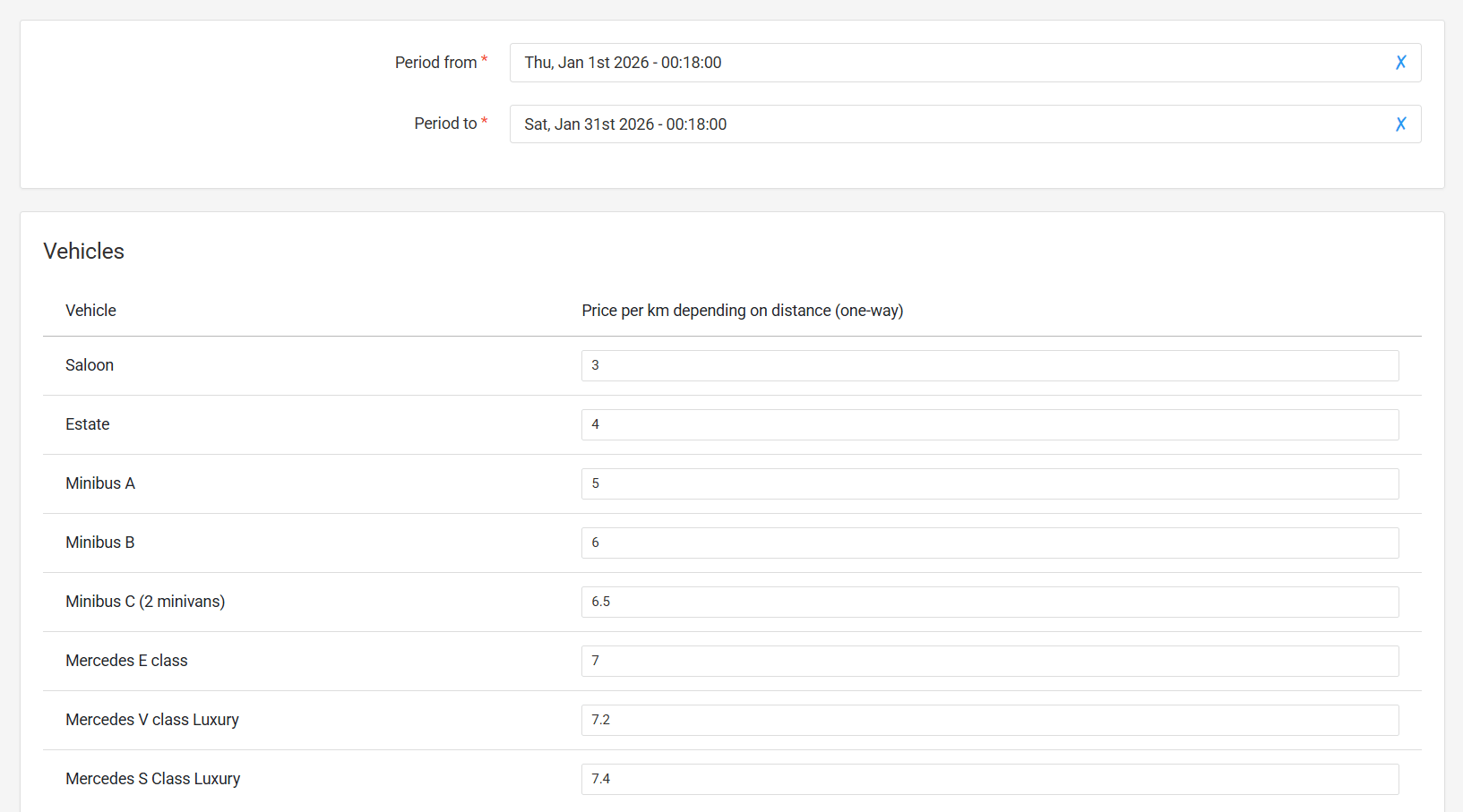 Absolutely. You can set both fixed and per-kilometer prices based on distance, time, location, and special conditions like airport surcharges, peak hours, time of day, holidays, and more. You can also create custom fares for specific zones or trips between different areas, including extra charges for time spent on the road.